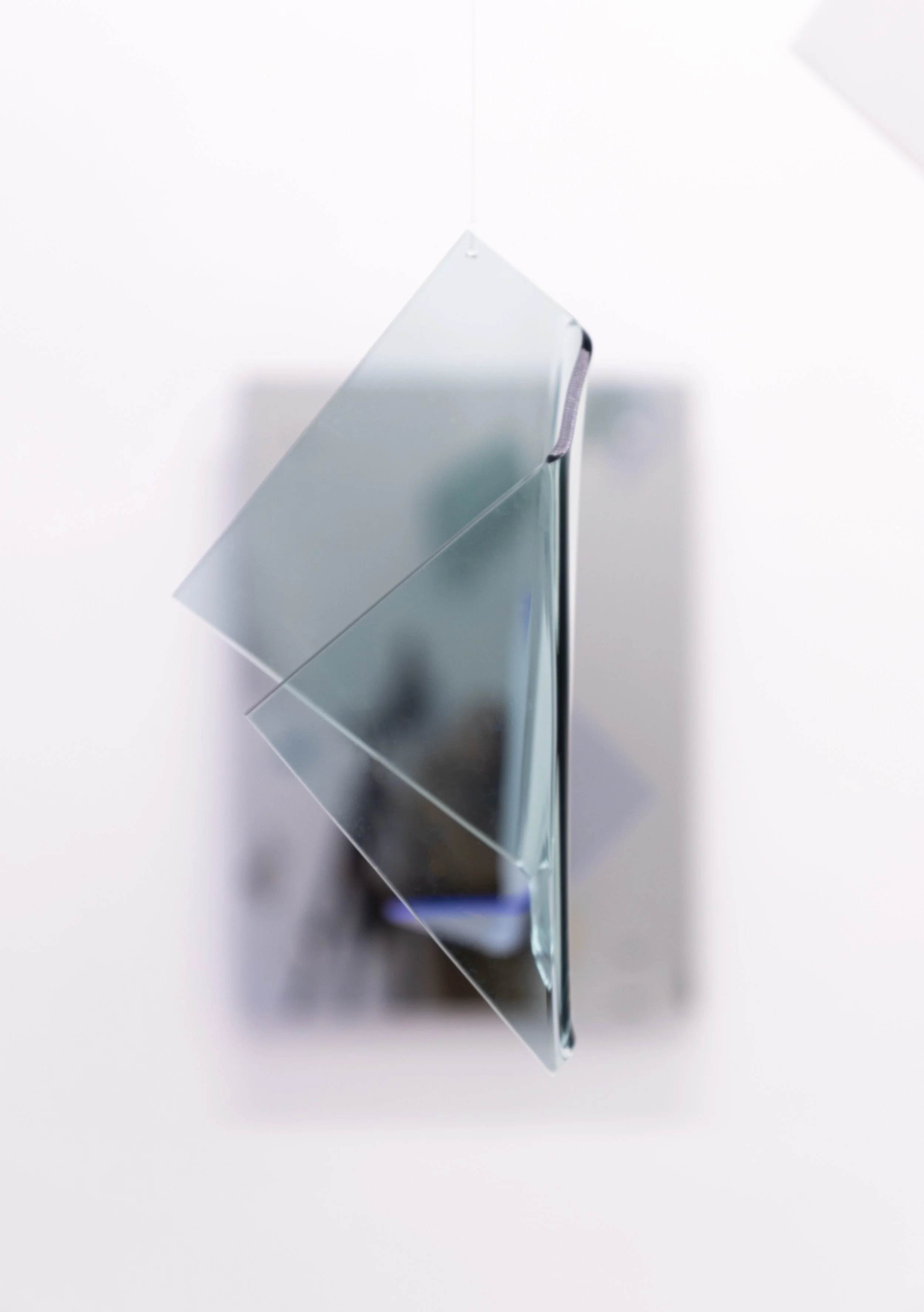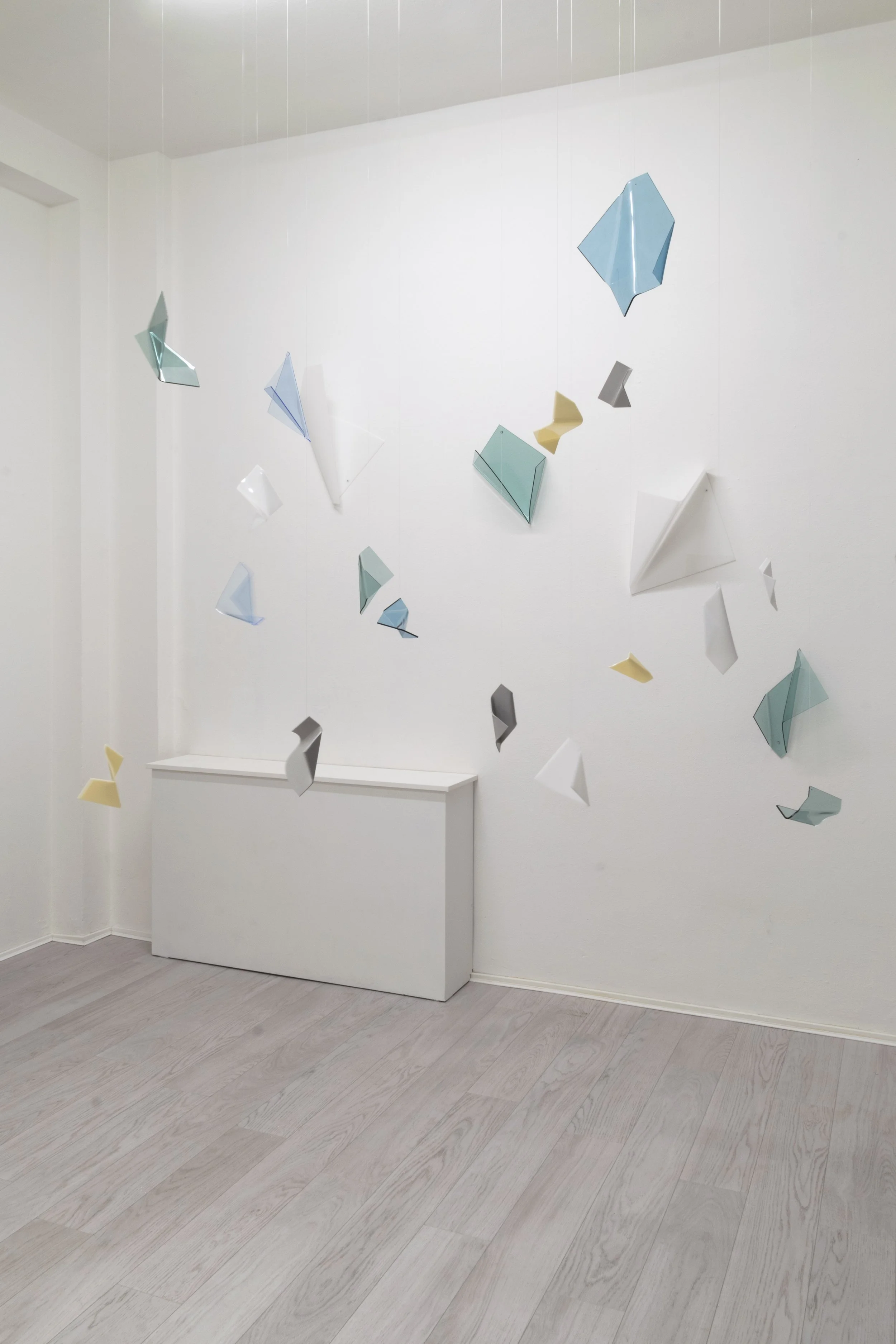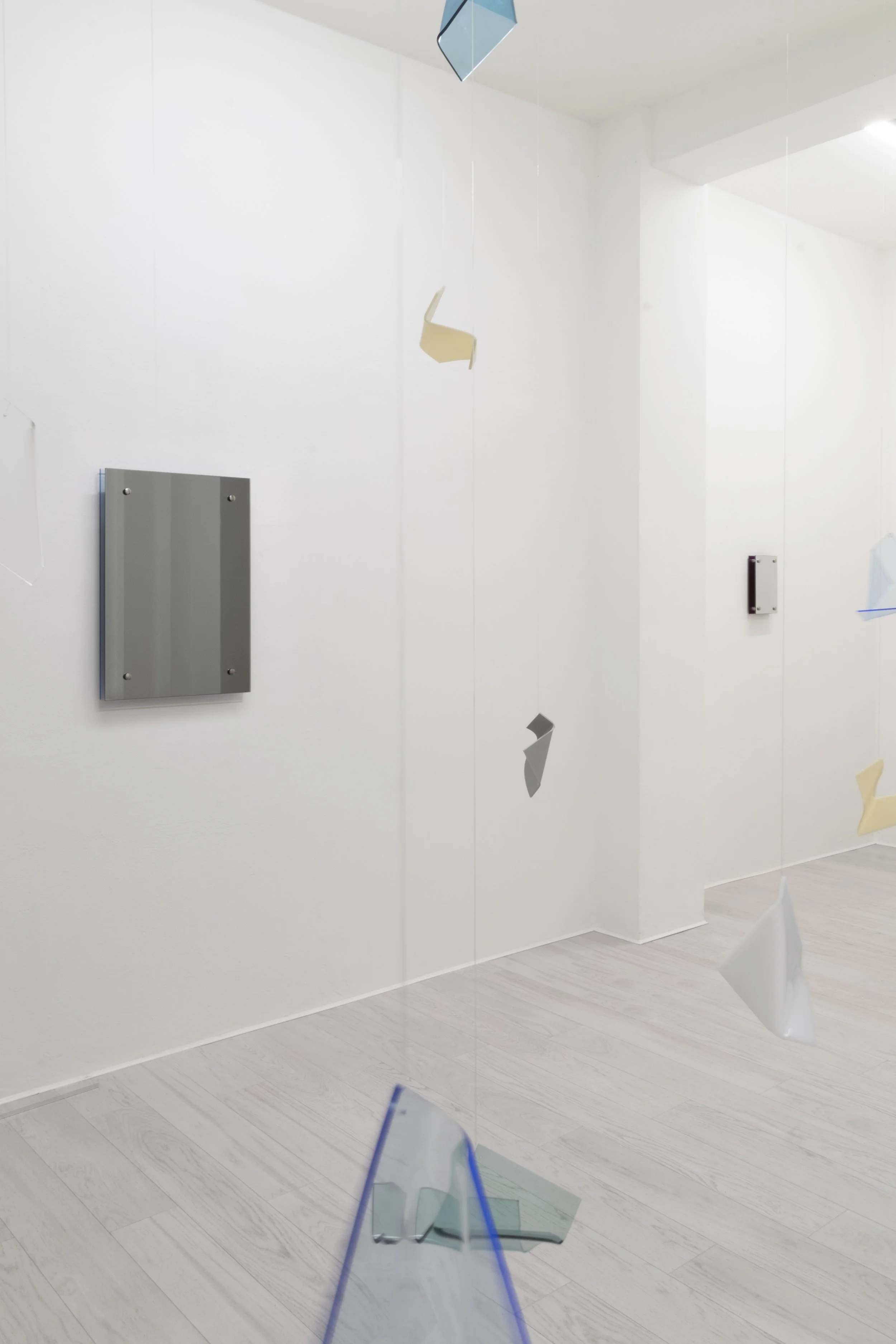 Le opere, come il vento, sono figlie di una fine: attingono dal ricordo e dal passato, una porta serrata che d’improvviso si spalanca come per un colpo d’aria. Aeree [F] di Giulia Fumagalli invade il cielo nella stanza, sculture in plexiglass fuso e rimodellato e un’opera a parete che ricordano l’ipotetica costruzione di un aeroplanino di carta.